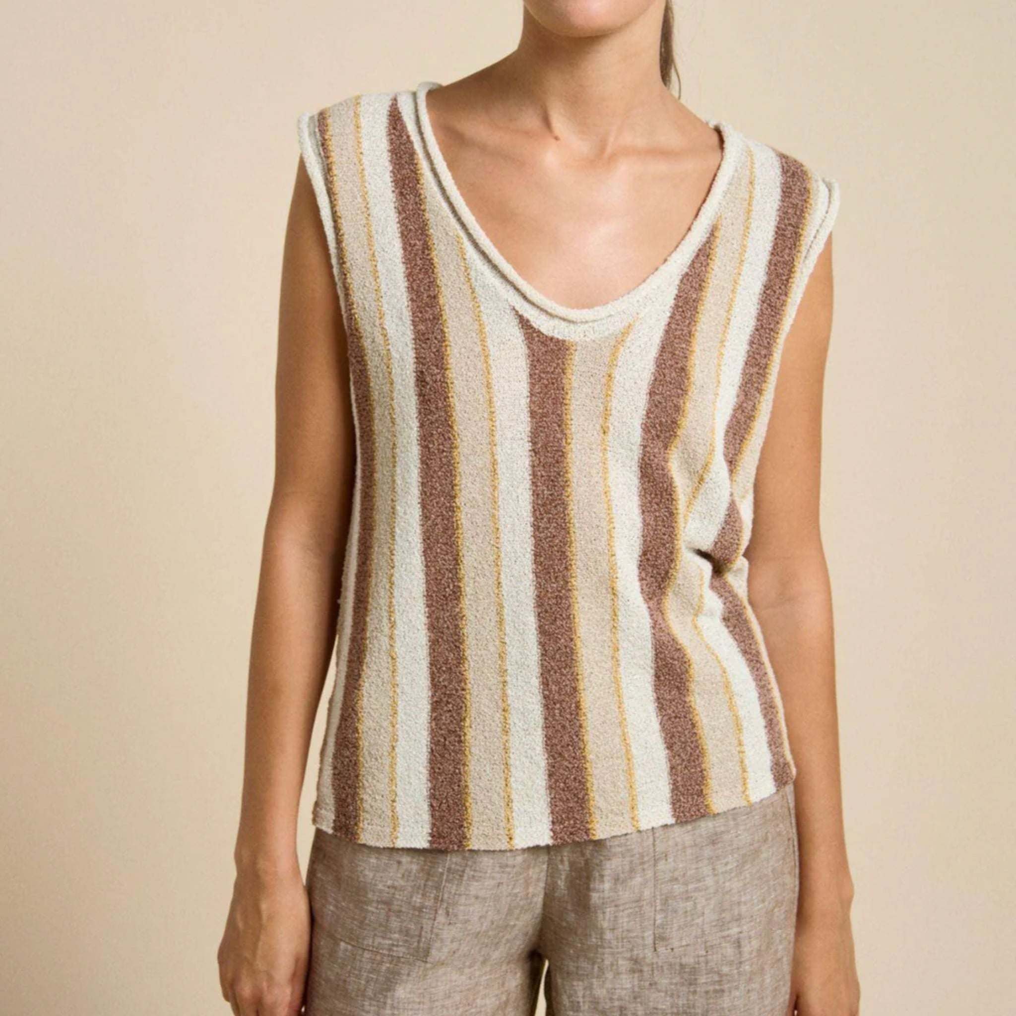 The Clovelly Tank by Little Lies offers a playful nod to the ’70s with its bright stripes and retro style. Made from soft, comfortable fabric and sleeveless for ease, this tank is designed to keep you cool and carefree during warm days. Its light, breezy feel makes it an ideal choice for adding vintage charm and relaxed comfort to your summer wardrobe.
