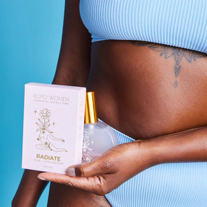 The Radiate Body Mist embodies the fire sign element (Aries, Leo, Sagittarius) and comes with a beautiful gold foil Fire Woman Tarot Card.