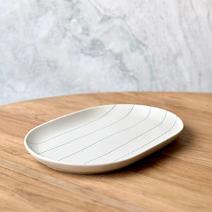 Each piece is hand painted with a refined linear stripe, giving it a unique character and artistic finish. Crafted from high fired stoneware, this platter is as durable as it is beautiful, ready for both casual dinners and special occasions.