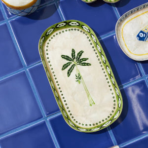 Bring the vibrant beauty of the tropics to your home with the Atlantic Green Palm Tray. This eye catching small oval tray is handcrafted from capiz shells, giving it a luminous, shimmery finish. The centrepiece is an original painting of a lush green palm tree, its fronds sweeping across the surface. Surrounding the palm, a bold geometric pattern in greens. This artisan-made tray adds a touch of island vibes wherever you place it. With its natural materials and hand-painted designs, the Atlantic Green Palm Tray transports you to your own seaside paradise.