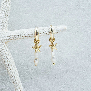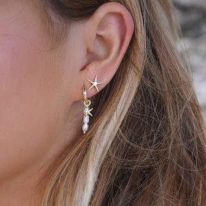 A little piece of the ocean’s magic, made to dance in the sunlight. Our Selene Starfish Drops pair a sleek gold hoop with a delicate pendant of three lustrous freshwater pearls and a starfish charm—like treasures collected from a morning tide pool. Crafted in sterling silver with 14k gold plating, they’re ocean-safe, waterproof, and designed to shine just as beautifully as you.