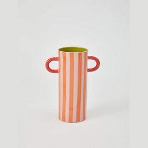 Introducing our Griffe Vase Collection. Each vase in this series features unique designs, including hand-painted florals, bold stripes, or vibrant multi-coloured spots. The name "Griffe," German for handles, reflects the dynamic silhouette of these vases, with two solid handles on either side adding an extra design punch! Whether displayed individually or paired together, these vases are perfect for creating a playful vignette on your bookcase, mantel, or shelf, adding a pop of colour and personality to any surface in the house.