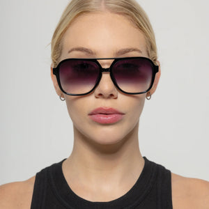Sleek, sharp, and effortlessly elevated, KORI in black is the ultimate cool-girl aviator. Featuring a minimalist black frame and faded smoke lenses, this style delivers a modern edge with subtle drama.