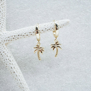 These golden hoops swing with delicate palm tree charms, bringing a hint of tropical adventure to your everyday look. Perfect for sunny beach days, sunset strolls, or anytime you want a little slice of island magic with you.