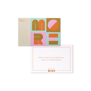 No matter how well you know someone, there's always more to discover. Tell Me More is a thoughtfully designed card deck featuring 52 conversation starters that invite deeper understanding, shared laughter, and meaningful moments. Whether it's with a partner, family member, or friend, these prompts encourage open dialogue and strengthen bonds.