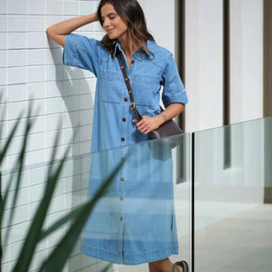 Meet the Short Sleeve Yoke Detail Midi Dress, a fresh take on the best selling long sleeve version. Crafted from a soft 8.6 ounce lightweight organic cotton denim, this dress offers a relaxed boxy fit that drapes beautifully on the body. Its understated curved yoke and sleeve seam detail add a refined touch, while the midi length with side splits makes it perfect for effortless year round styling.