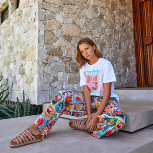 Make a bold statement with the Vermont Pant in our vibrant Spicy Summer print. Designed with a relaxed wide-leg fit and comfortable elastic waistband, these pants bring colour and movement to your everyday wardrobe. Pair with the matching shirt or a simple tank for an easy, standout look.