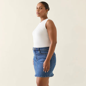 A modern wardrobe essential, the Margot Denim Skirt is made from stretch cotton denim with a high waist and mini length. Designed with a fly front, belt loops, and five functional pockets, and finished with branded button and a leather brand tab.