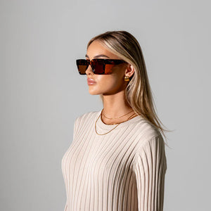 The Rhodes brings a timeless oversized square shape, effortlessly blending classic style with a modern edge. This design is all about sleek sophistication, featuring a sturdy thick temple arm, a bold black frame, and striking UV400 blue lenses that offer both style and protection.
