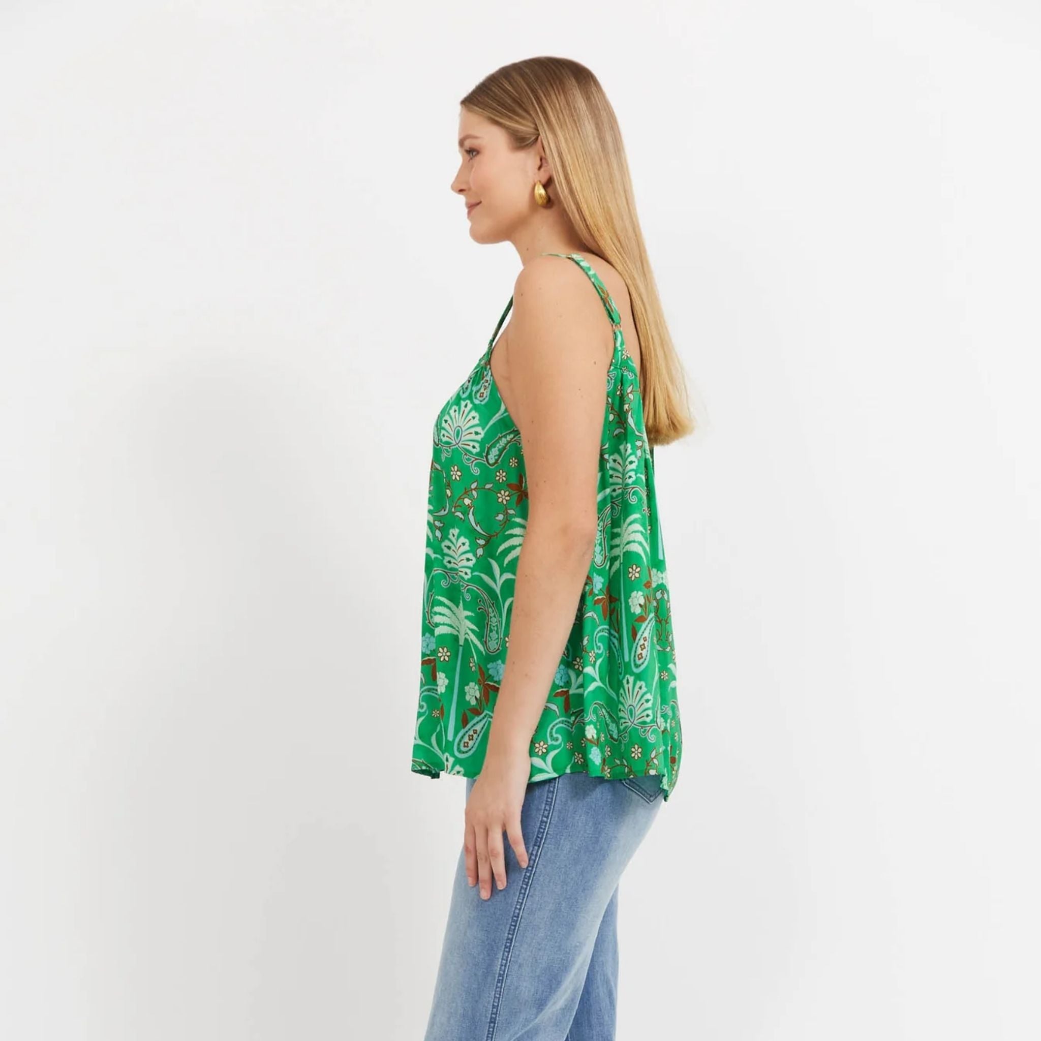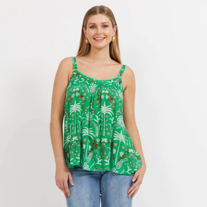 The Haiti Tank is your throw-on-and-go summer essential. Designed with a loose swing silhouette and hip-length cut, it offers relaxed comfort with a feminine twist. Adjustable straps with gold hardware let you customise the fit, while the scoop neckline, soft gathering, and ric-rac trim add playful charm.