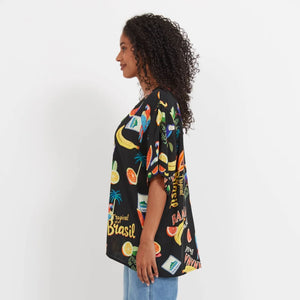 The Cabana Button Top features a button-through front, short sleeves with border trim, and a thigh-length relaxed fit. Designed in a breathable fabric, it offers a flattering drape and an easy silhouette with a box pleat at the back for added shape. Pair with the Cabana Pant for a coordinated, vacation-ready look that's equally suited for day outings or laid-back dinners.