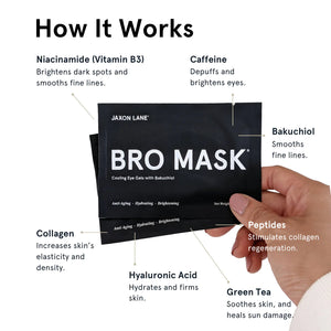 Bro Mask Eye Gels are made of the same hydrogel as the original Bro Mask, but specifically targets puffy eyes, fine lines and dark circles.