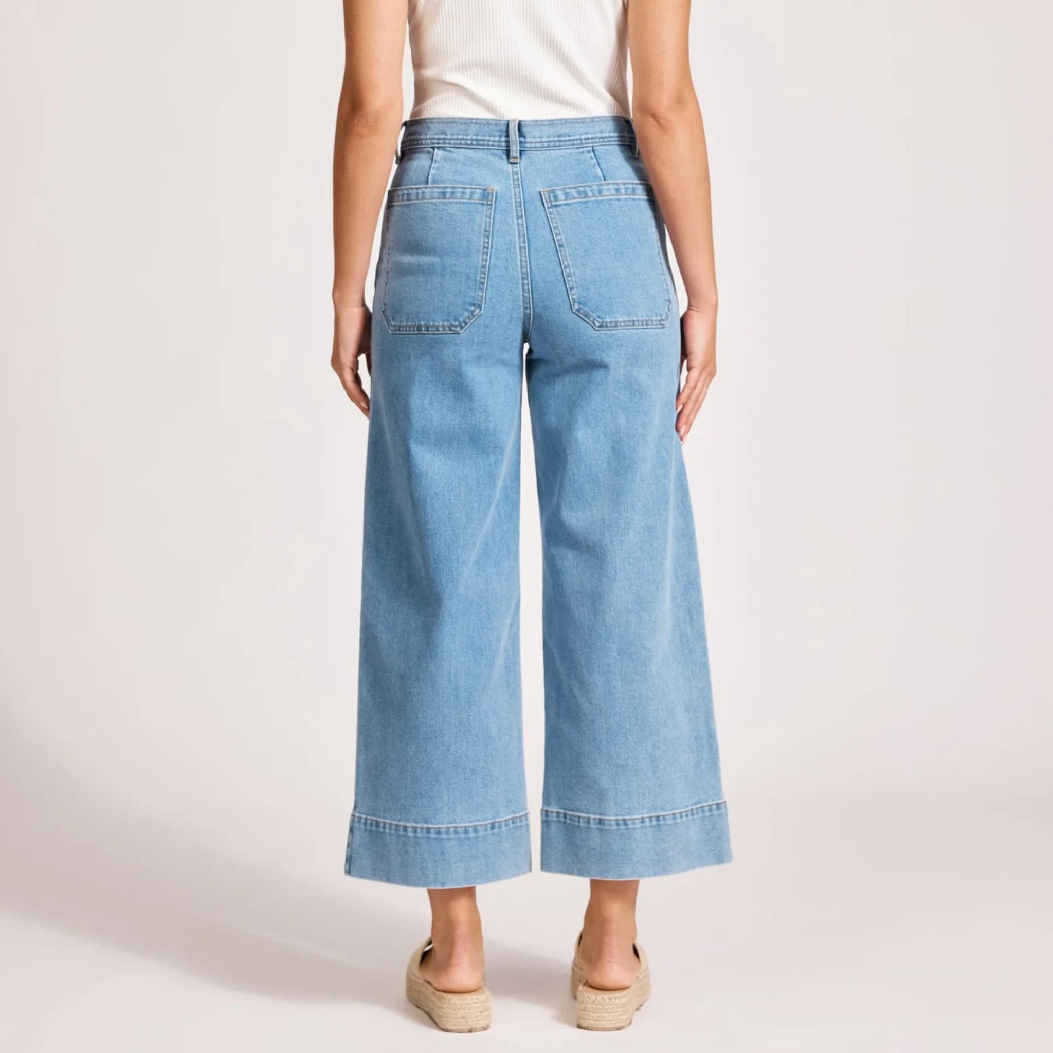 A slim A-line denim style for everyday wear. Crafted from cotton-rich stretch denim. Features a 7/8 length, fixed waist with belt loops, and wide cuff detail at the hem. Complete with contrast stitching and functional back pockets.