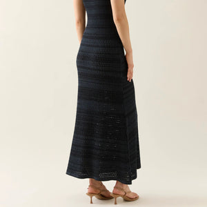 A textural pointelle-knit dress crafted from 100% cotton. This 7/8-length dress features mixed two-tone woven fibres for visual depth, a rounded neckline, and a softly flared mermaid-style hem. This dress offers subtle glimpses of skin.
