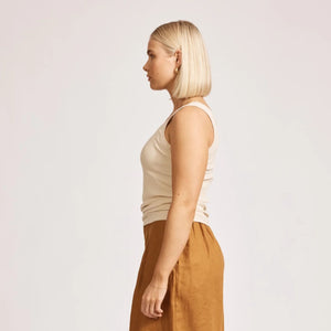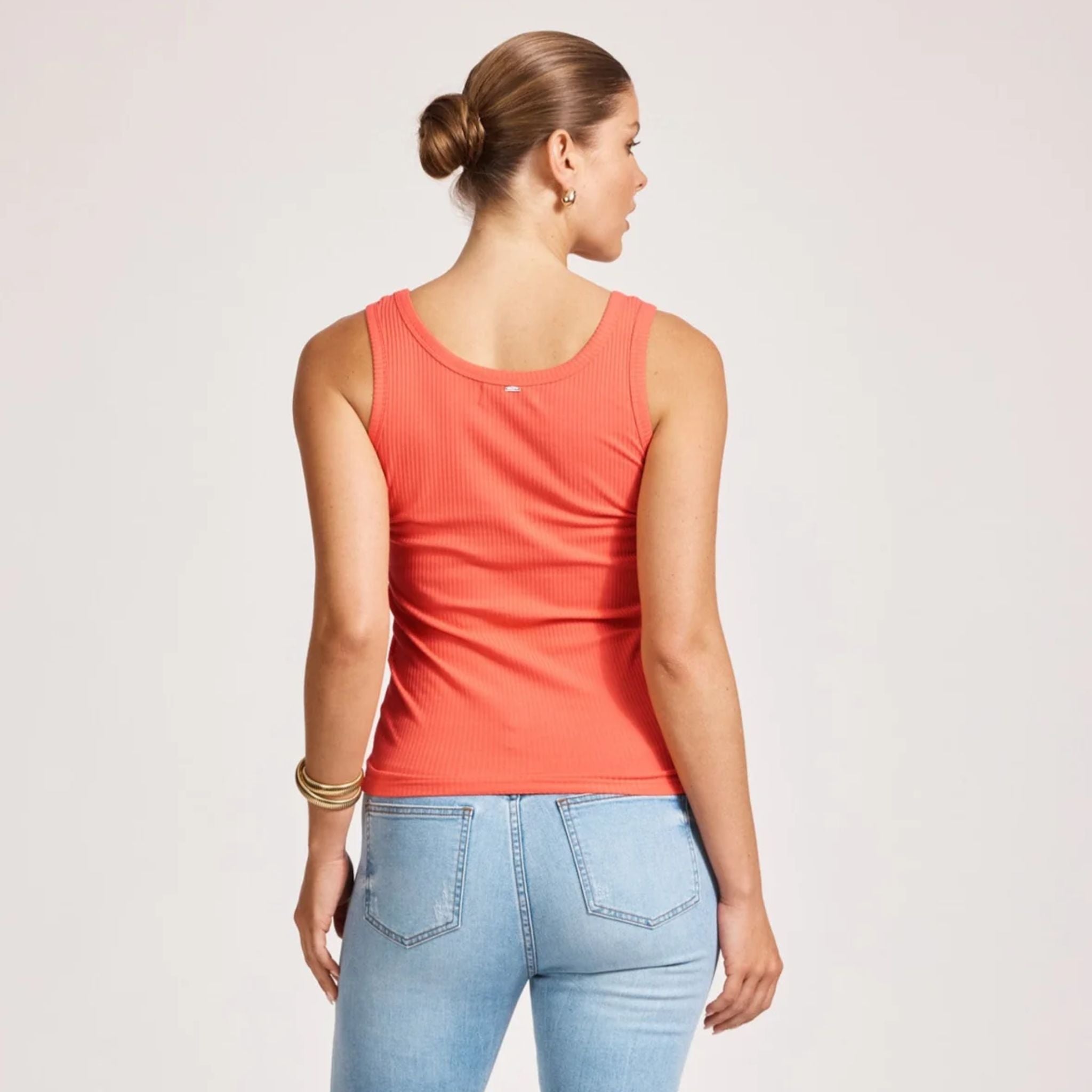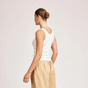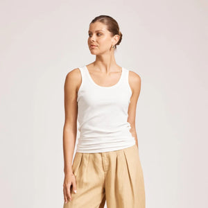 An essential summer staple. Crafted from cotton-rich ribbed fabric for comfort and stretch. Features a scoop neckline, sleeveless design, and small brand detail at the back neck.