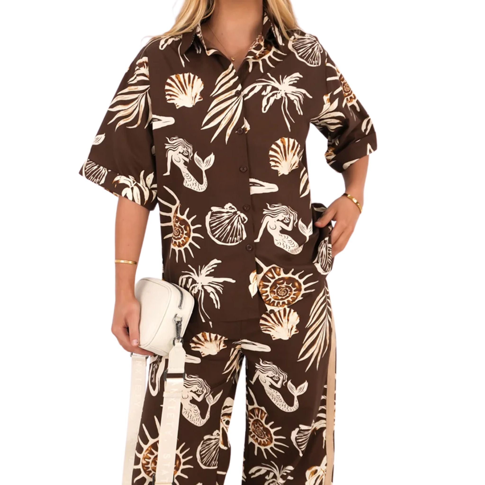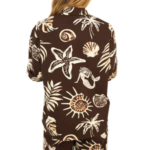 Crafted from a breezy lightweight fabric in a rich chocolate brown base, it features a striking tropical print of palms, shells, and sunshine motifs that capture all the island vibes. The relaxed, oversized silhouette makes it easy to wear as a dress, or style open over swimwear for a laid-back resort look.