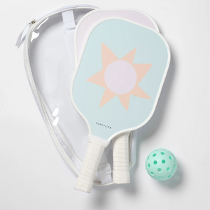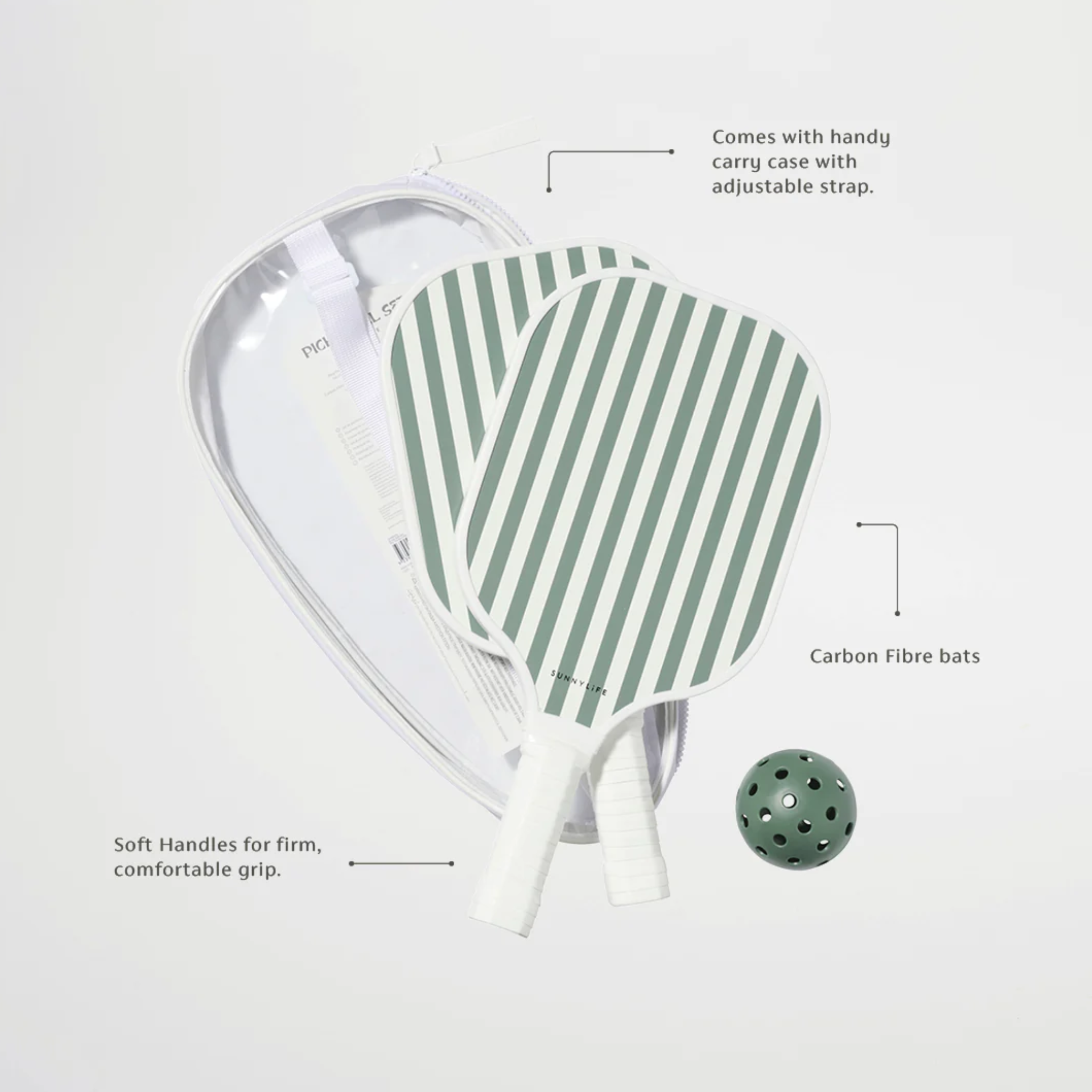 Get ready to play away the day in style. The Pickleball Set is ultra-trendy and high quality, designed to make a statement and have you winning on the court. Made from carbon fibre material that is durable and lightweight and comes complete with two pickleball paddles, one branded SUNNYLiFE ball, and a handy carry bag, grab a partner, hit the playing court, and serve up some serious fun.