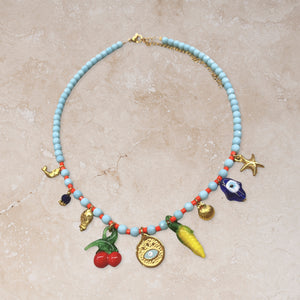 Brighten up your look with a pop of colour and a dose of fun. This necklace features vibrant rainbow-toned beads paired with quirky little fruit-shaped charms. She's playful, joyful and so summery. With gold-plated copper accents giving a touch of polish, it’s the perfect blend of relaxed and refined. Sitting at approximately 36cm plus an adjuster, it hugs the collar gently for easy layering or solo wear.