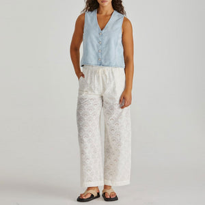 The Sabine Denim Vest brings retro energy to your look. Featuring soft denim, princess seams and branded buttons, it’s easy, cool and endlessly wearable. Style it solo or layered for an on-trend set vibe.